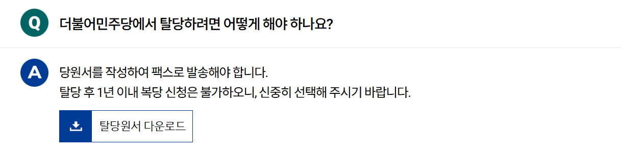 - 정당법에 따라 이중당적은 금지되어 있으므로, 다른 정당 가입 시 자동 탈당 처리됩니다.
